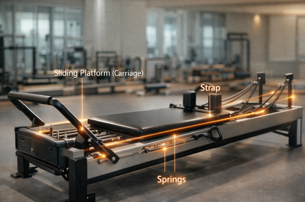 리포머는 슬라이딩 플랫폼, 스프링, 스트랩, 푸시바 등으로 구성된 기구입니다. 사용자는 스프링 저항을 조절해 운동 강도를 세밀하게 설정할 수 있습니다. 이 저항 시스템 덕분에 초보자부터 숙련자까지 단계별 접근이 가능하다는 점이 특징입니다.